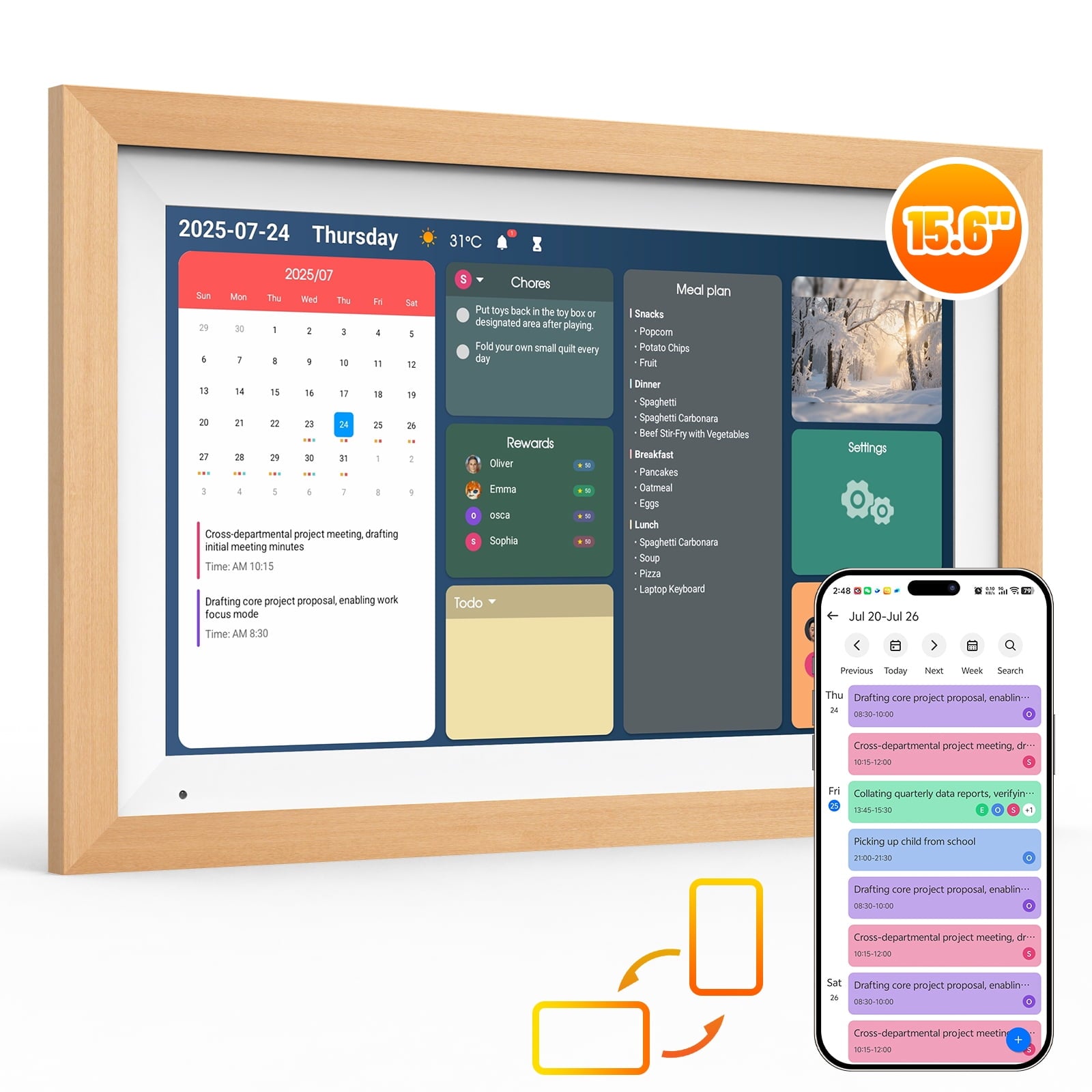 AEEZO Wifi15.6" Smart Digital Calendar ¨C 1920¡Á1080 Full HD Touchscreen Family Planner & Calendar with Chore Chart & Meal Planner, Wall-Mountable,Black+ Wooden Frame