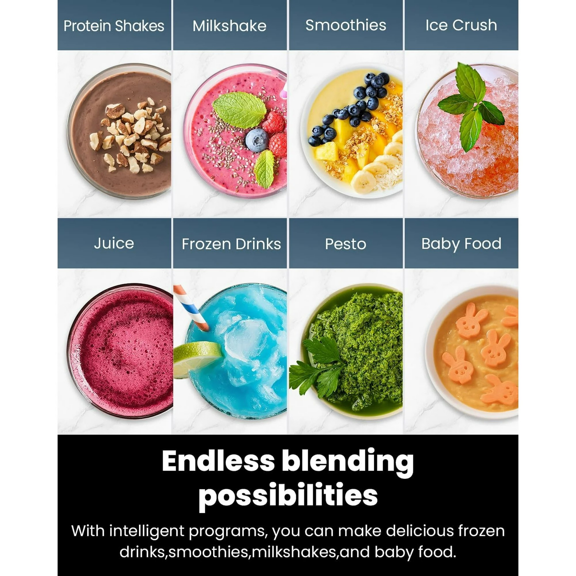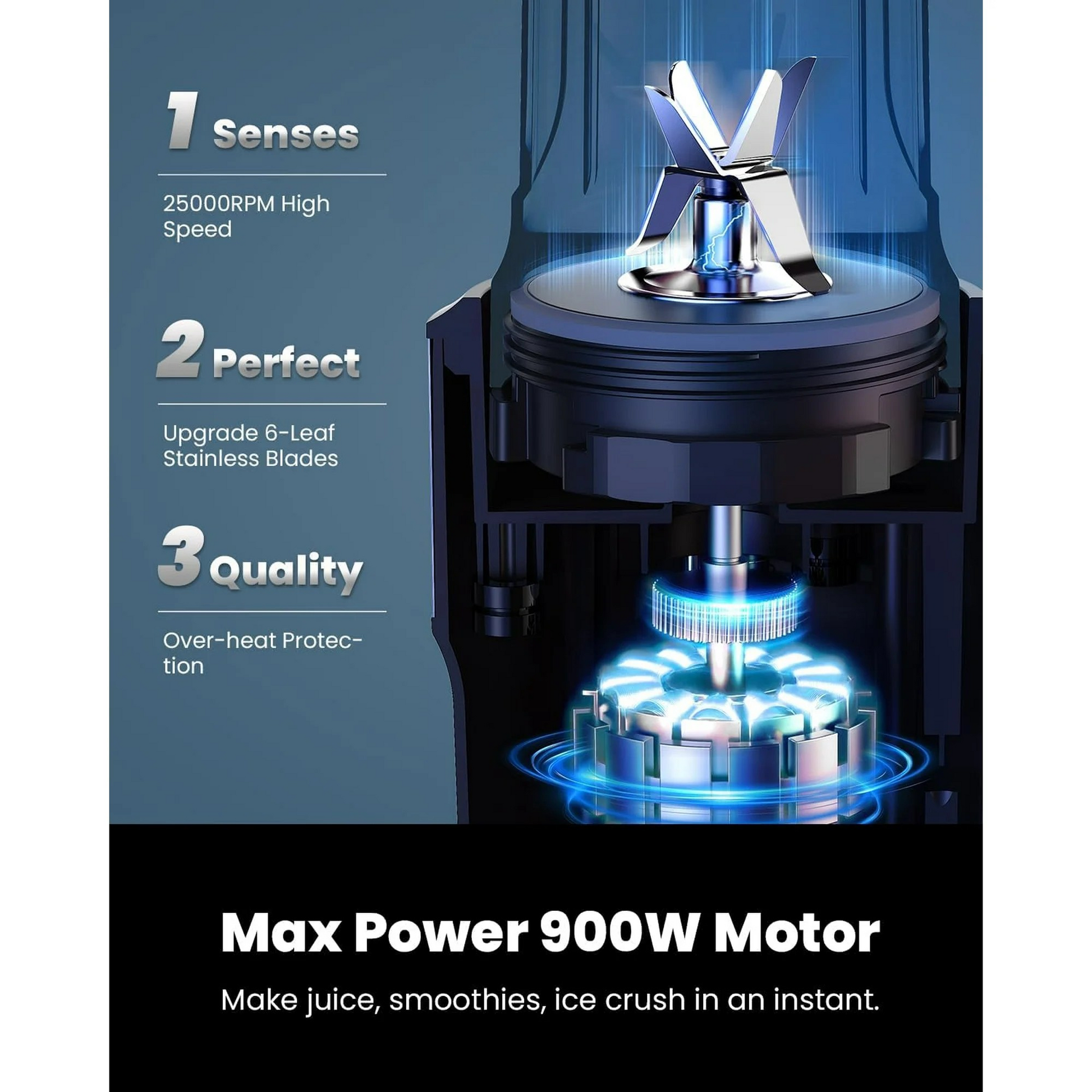 - 【High-Powered 900W Motor】Equipped with a Max power 900W motor,this smoothie blender reaches speeds of up to 25000RPM for quick and efficient blending. Crush ice cubes and frozen fruits with ease.